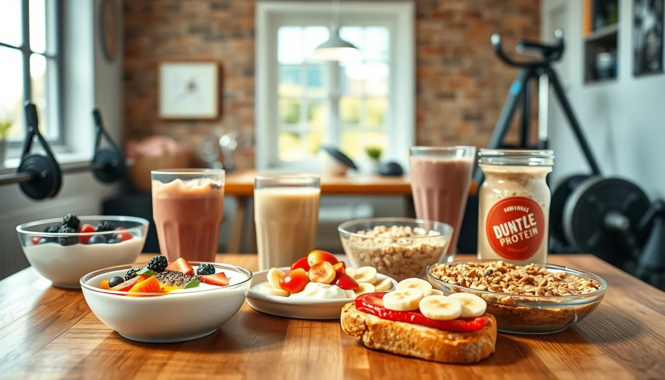 High-protein breakfasts for gym-goers include egg dishes like omelets. You can also try protein pancakes with whey protein. Overnight oats with Greek yogurt and smoothies with nut butter and protein powder are great too. These meals help with muscle recovery and give you energy all day.