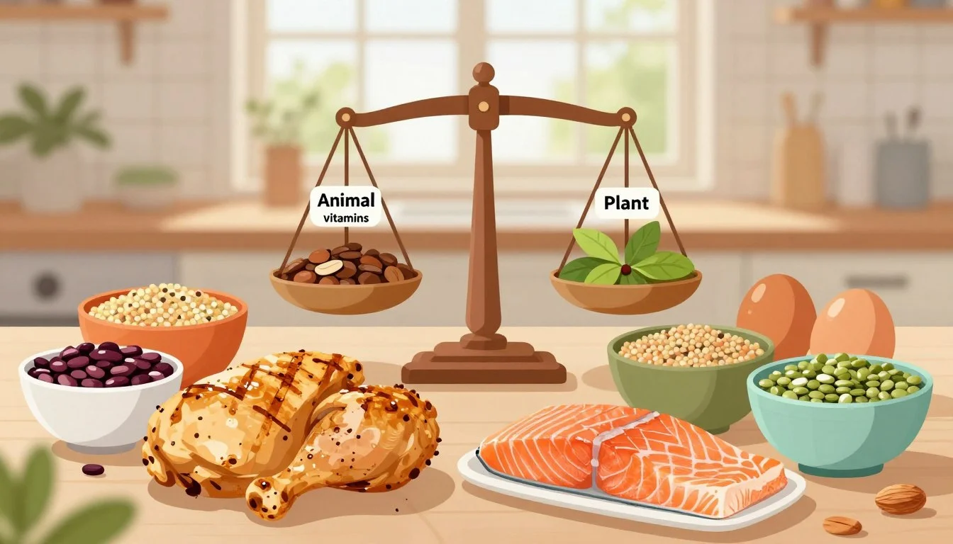 Animal proteins have more B vitamins, iron, and calcium but more unhealthy fats. Plant proteins have more fiber, antioxidants, and less saturated fats. This makes them good for heart health and digestion.